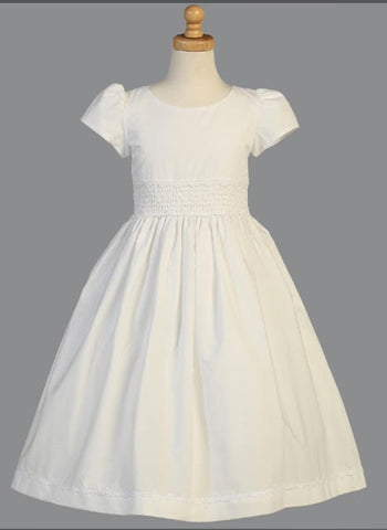 Cotton dress with smocked waistband. Tea-length. Made in the U.S.A. Accessories are sold separately.